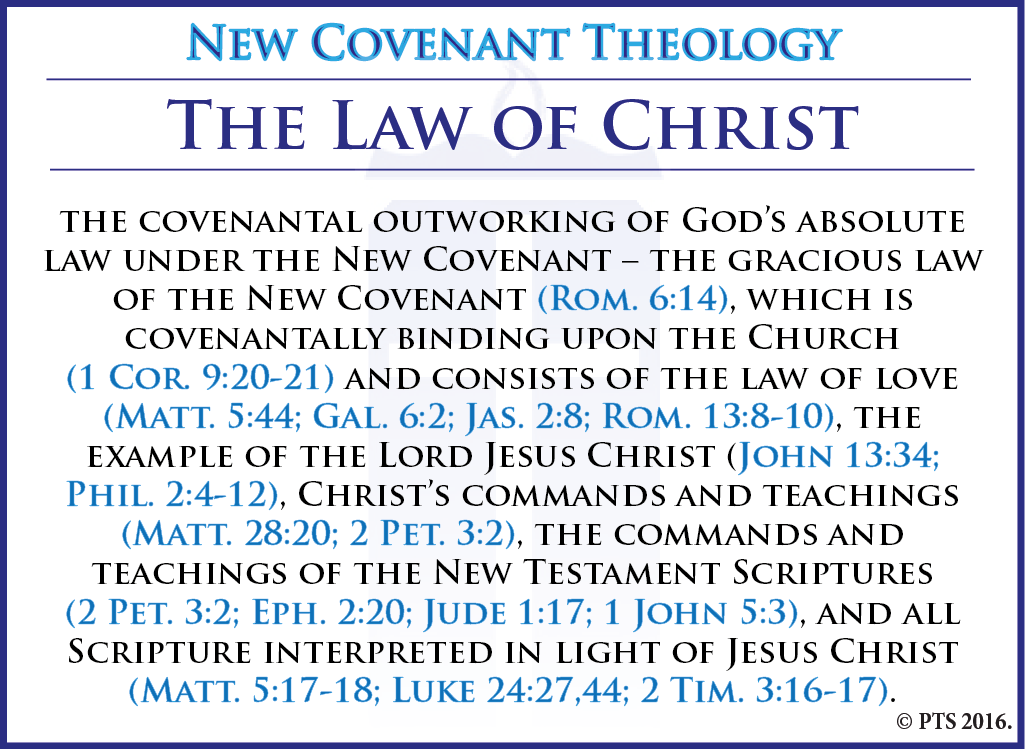 | As a NCT institution, Providence Theological Institute understands the Law of Christ in the following manner: the covenantal outworking of God's absolute law under the New Covenant - the gracious law of the New Covenant (Rom. 6:14), which is covenantally binding upon the Church (1 Cor. 9:20-21) and consists of the law of love (Matt. 5:44; Gal. 6:2; Jas. 2:8; Rom. 13:8-10), the example of the Lord Jesus Christ (John 13:34; Phil. 2:4-12), Christ's commands and teachings (Matt. 28:20; 2 Pet. 3:2), the commands and teachings of the New Testament Scriptures (2 Pet. 3:2; Eph. 2:20; Jude 1:17; 1 John 5:3), and all Scripture interpreted in light of Jesus Christ (Matt. 5:17-18; Luke 24:27,44; 2 Tim. 3:16-17). |
