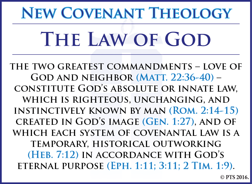 | As a NCT institution, Providence Theological Institute understands the law of God in the following manner: the two greatest commandments - love of God and neighbor (Matt. 22:36-40) - constitute God's absolute or innate law, which is righteous, unchanging, and instinctively known by man (Rom. 2:14-15) created in God's image (Gen. 1:27), and of which each system of covenantal law is a temporary, historical outworking (Heb. 7:12) in accordance with God's eternal purpose (Eph. 1:11; 3:11; 2 Tim. 1:9). |
