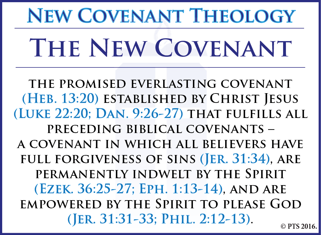 | As a NCT institution, Providence Theological Institute understands the new covenant in the following manner: the promised everlasting covenant (Heb. 13:20) established by Christ Jesus (Luke 22:20; Dan. 9:26-27) that fulfills all preceding biblical covenants - a covenant in which all believers have full forgiveness of sins (Jer. 31:34), are permanently indwelt by the Spirit (Ezek. 36:25-27; Eph. 1:13-14), and are empowered by the Spirit to please God (Jer. 31:31-33; Phil. 2:12-13). |