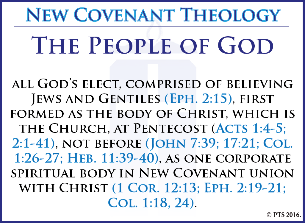 | As a NCT institution, Providence Theological Institute understands the people of God in the following manner: all God's elect, comprised of believing Jews and Gentiles (Eph. 2:15), first formed as the body of Christ, which is the Church, at Pentecost (Acts 1:4-5; 2:1-41), not before (John 7:39; 17:21; Col. 1:26-27; Heb. 11:39-40), as one corporate spiritual body in New Covenant union with Christ (1 Cor. 12:13; Eph. 2:19-21; Col. 1:18, 24). |